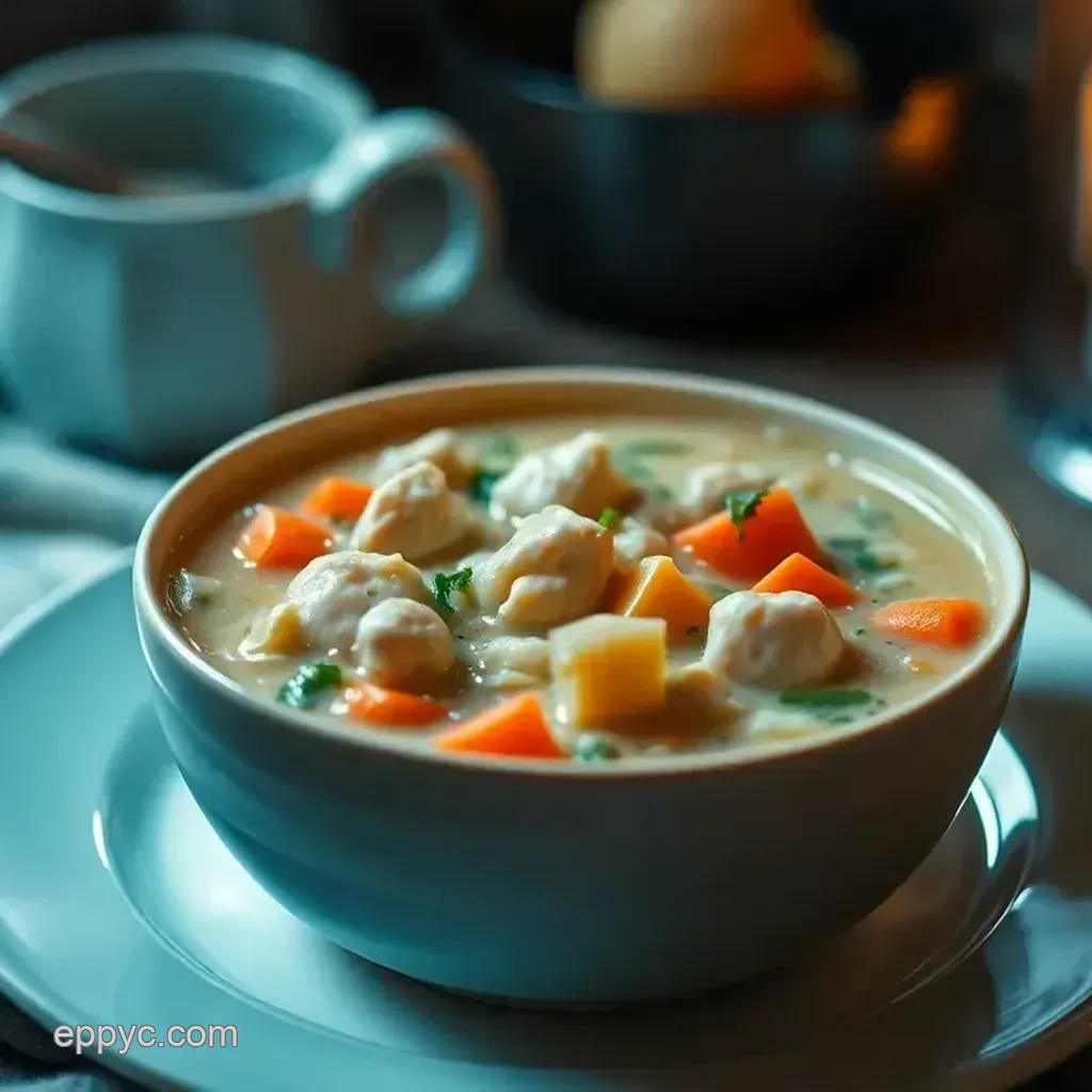 Picture this: creamy goodness with bits of tender chicken and colorful veggies, all swimming in a rich broth. it's like your favorite chicken pot pie but in soup form.