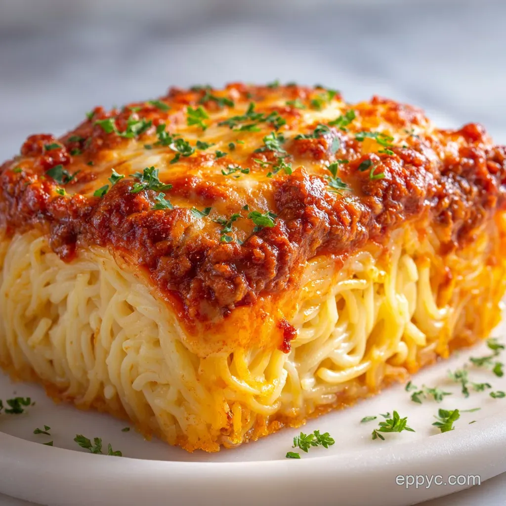 It is a savory baked pasta dish. It uses cooked spaghetti noodles mixed with eggs and cheese to form a solid, sliceable crust surrounding a layer of meat sauce and ricotta filling, topped with mozzarella.